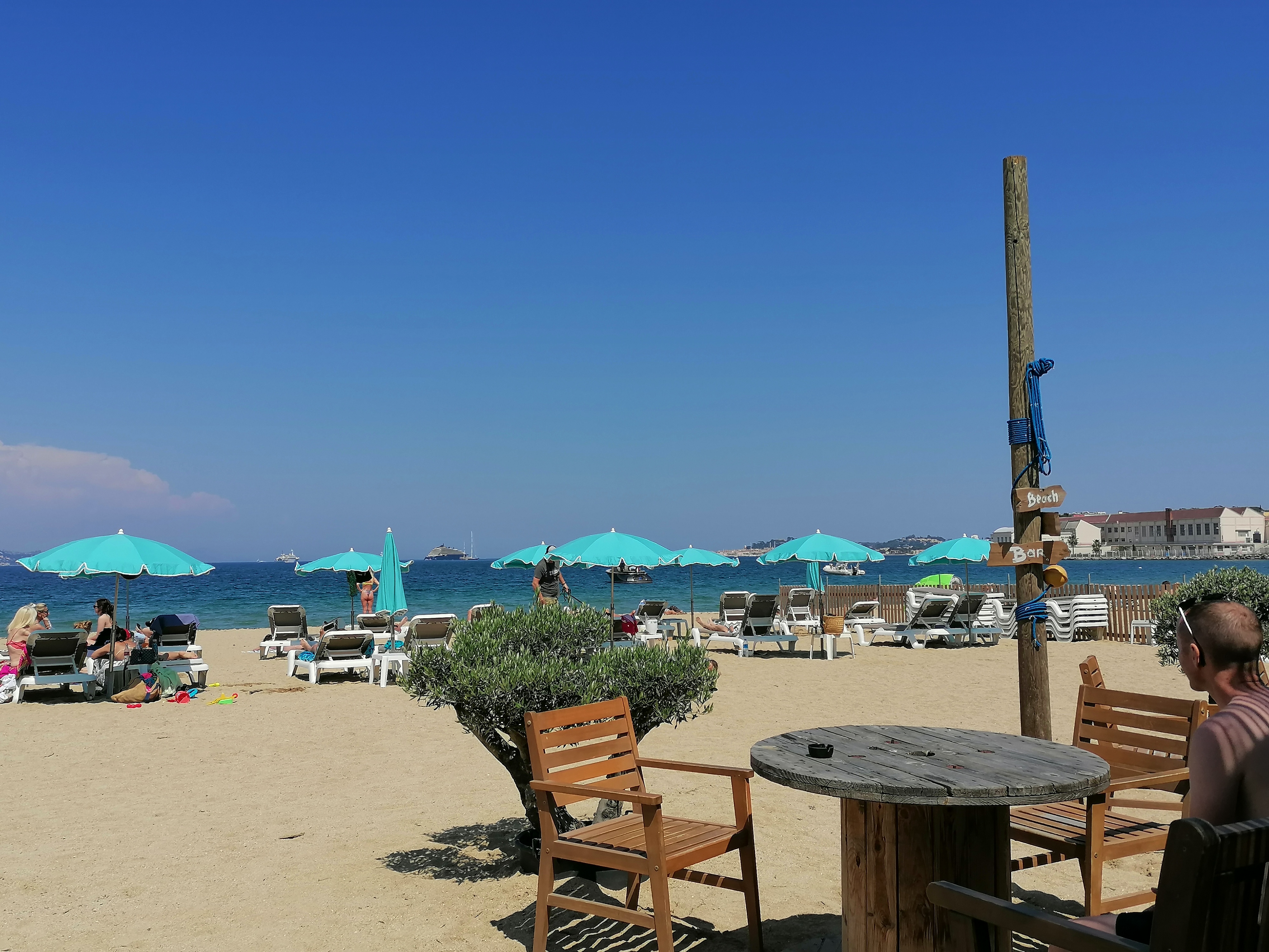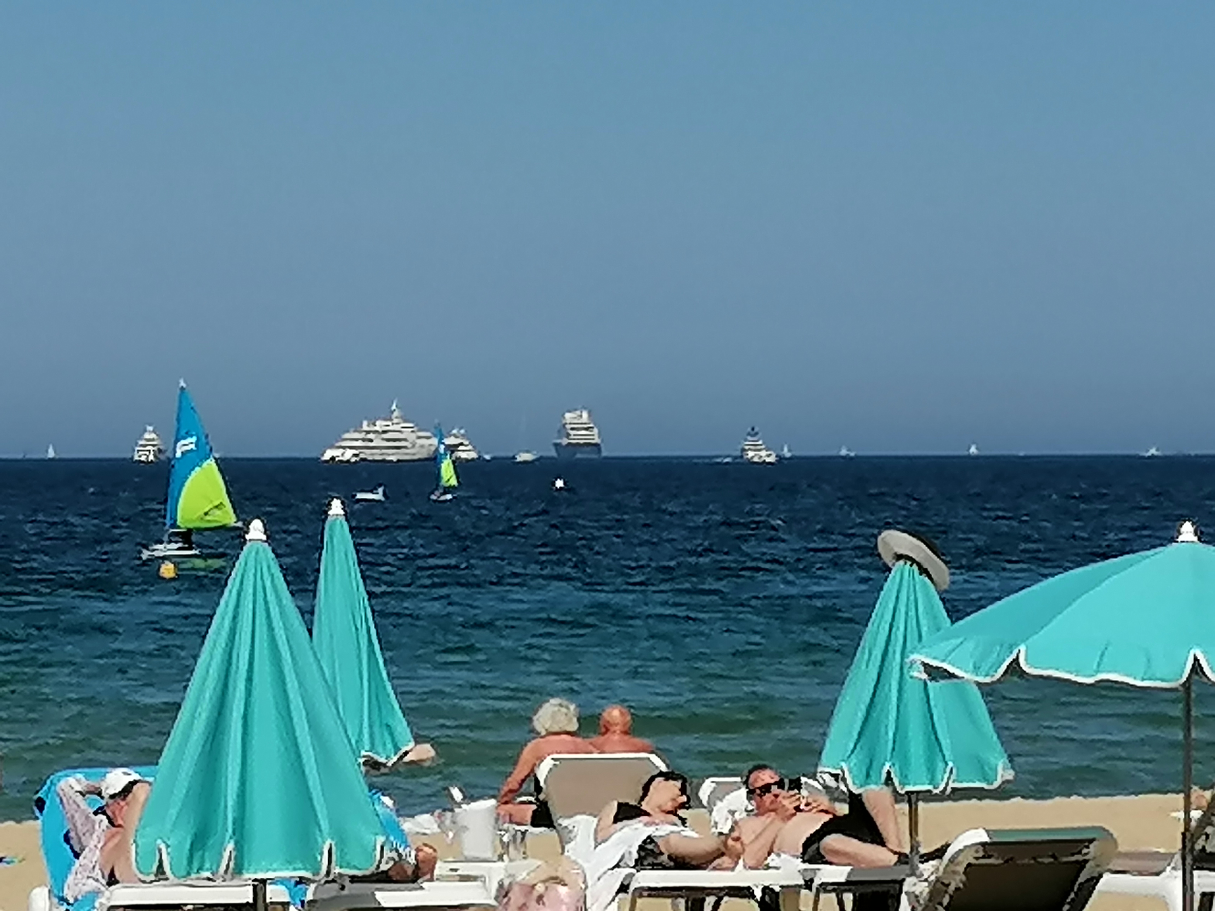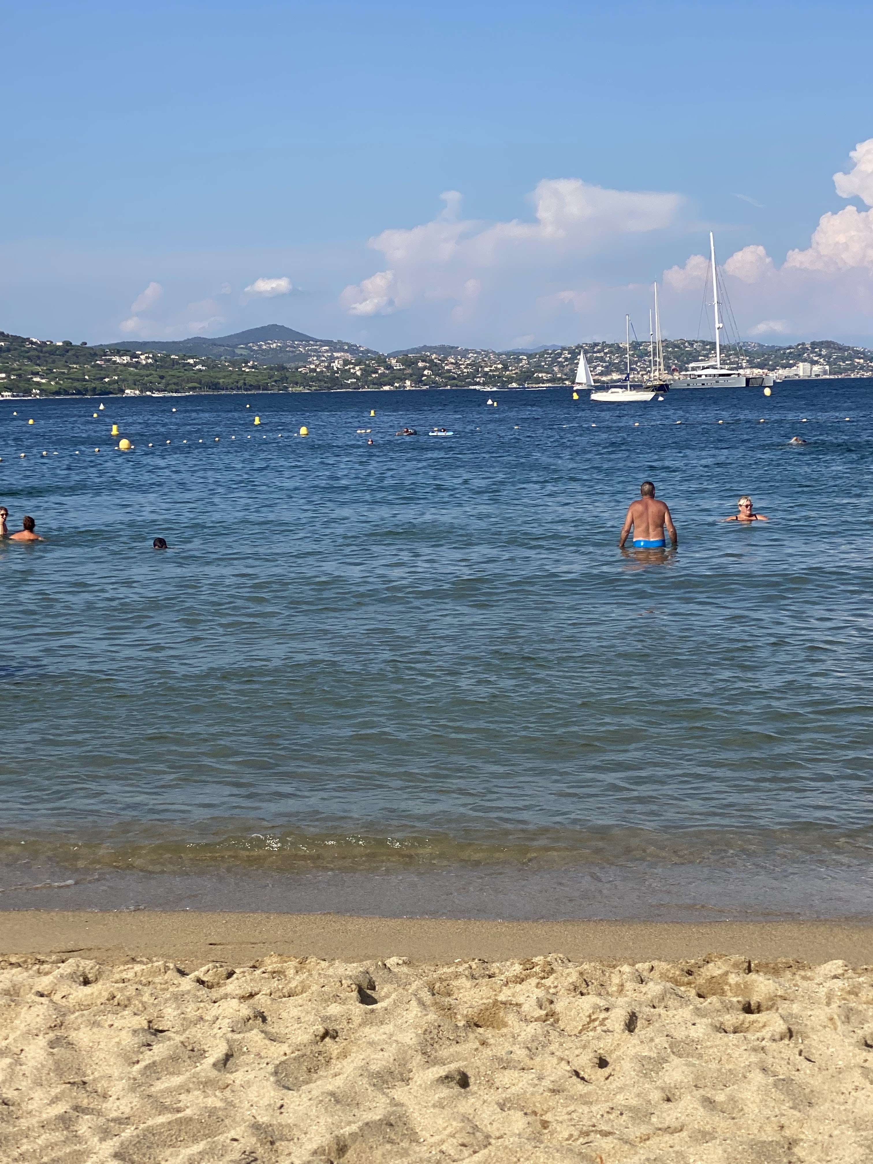 Belle plage étendue. Magnifique vue sur yachts au loin et sur la baie de St Tropez.