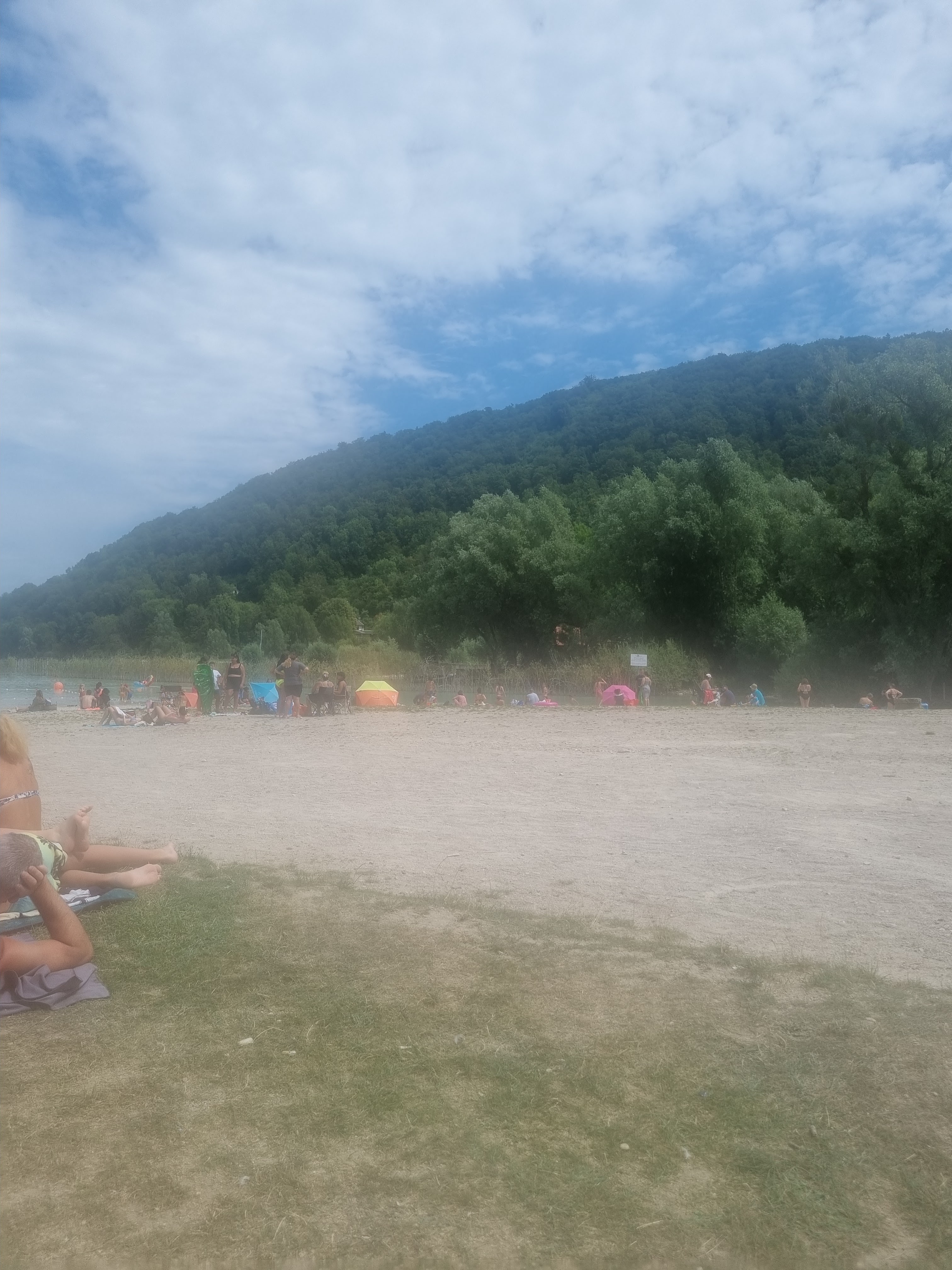 Baignade agréable mais plage de cailloux désagréable, il faut s'éloigner du bord pour trouver un peu de sable qui ressemble plus à de la vase. L'eau est trouble et le bruit est très présent. Dommage car le lac et le cadre sont magnifiques.